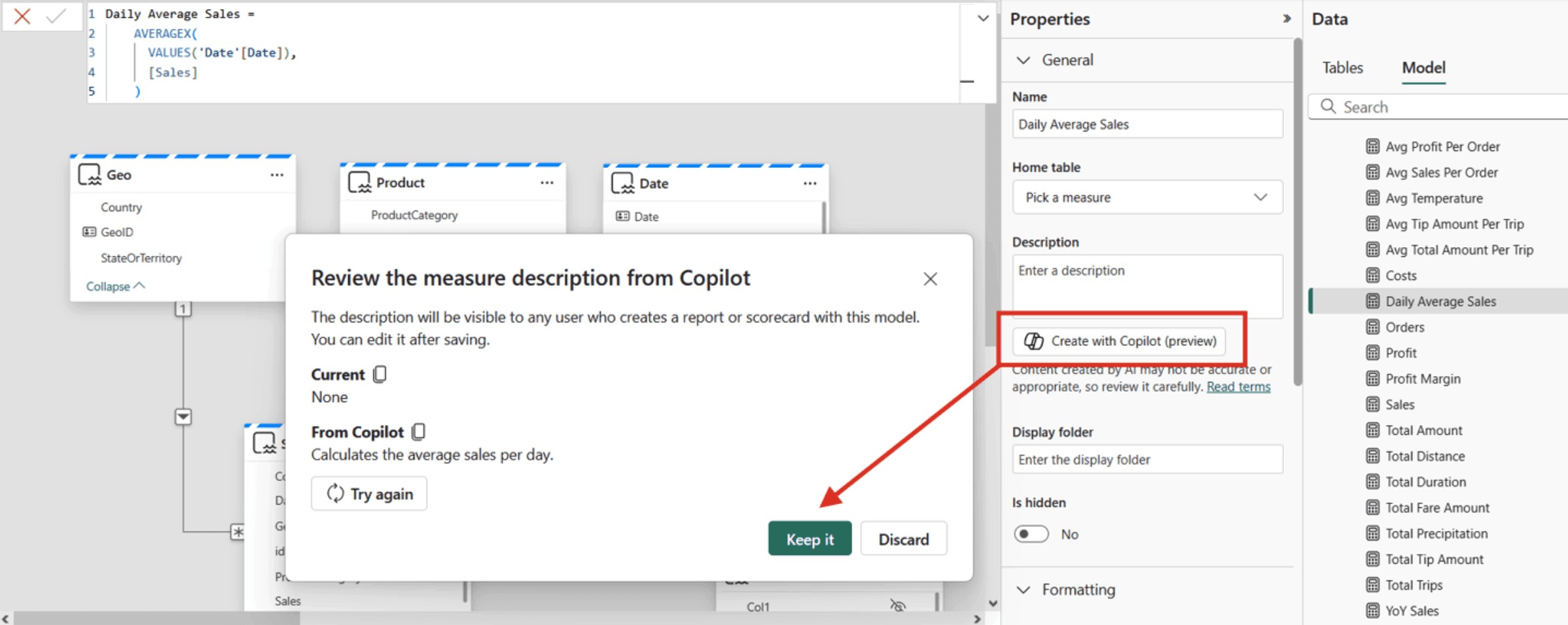With Copilot, descriptions are automatically generated in clear, human-readable language. Rather than starting from a blank page, we review and refine Copilot’s suggestions to align with business terminology. This saves time, improves consistency, and significantly enhances model clarity.