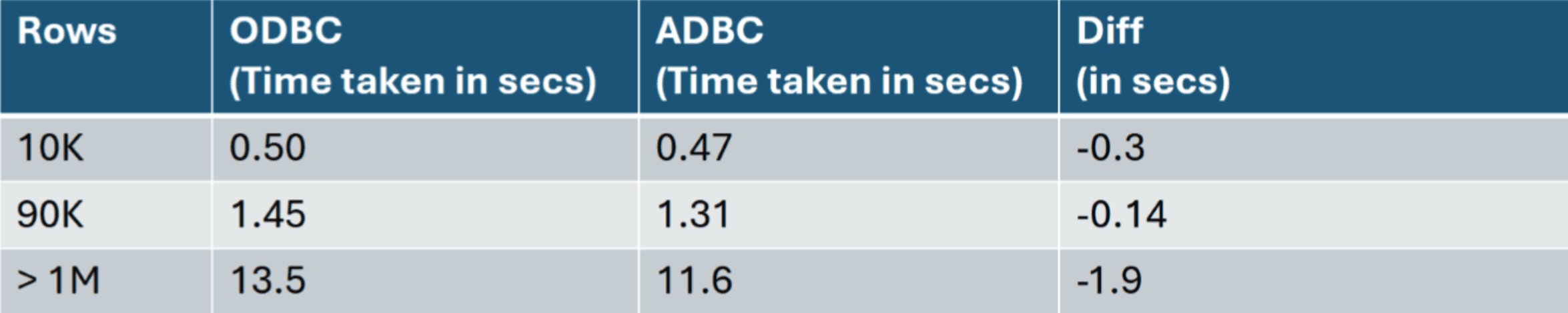 Next-Gen Data Connectors (Snowflake, Spark, Impala): Arrow-based 2.0 connectors for Snowflake and Spark/Impala bring major performance gains. By using Microsoft’s open-source ADBC driver, these connectors fetch large datasets with minimal overhead and improved security. For enterprises on Fabric or data lakes, this means much faster query times and more stable, scalable data access than legacy drivers. Below is a relevant experiment, when comparing the ODBC implementation (1.0) to the new ADBC implementation (2.0) using the NYC Taxi Green Dataset, the load time improvements were measured as: