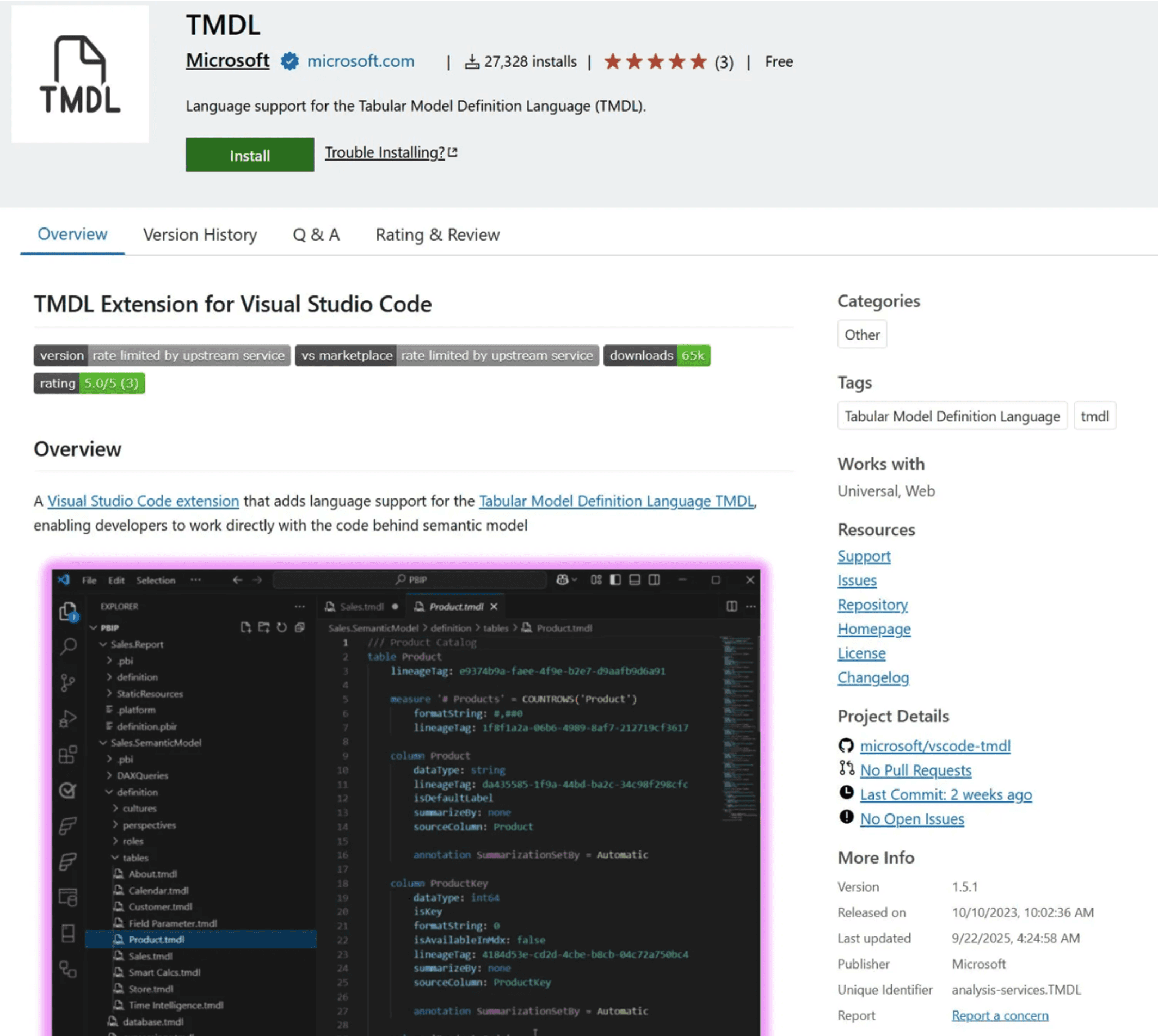 TMDL/VS Code Extension: The Visual Studio Code extension for Tabular Model Definition Language is now generally available. It brings rich IDE features (syntax highlighting, IntelliSense, refactoring) to Power BI model scripts. Development teams can manage models ‘as code’, apply bulk updates, and integrate semantic model projects with source control and AI tools dramatically improving developer productivity.